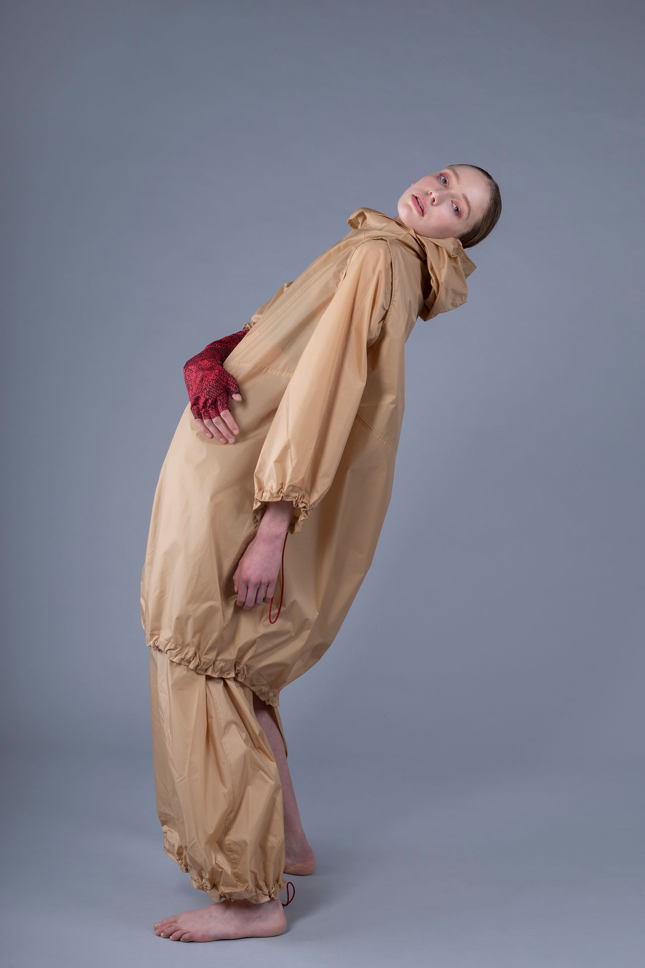 Width adjustability, waterproof materials, fluorescent fabric, taped seams and movement pleats underline the function of the clothing. Material, pattern and colour mixes give the outfits tension and energy.